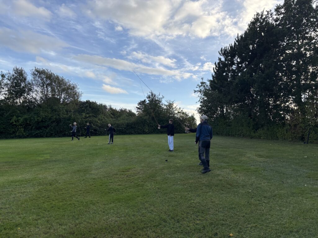 Rent praktisk var der også mulighed for at prøve fluebinderkunsten og der var stor interesse for at få prøvet sine evner af. Så der blev skabt grobund for et par vinteraftener hvor evnerne kan finpudses. Der var gjort klar på plænen til fluekast og en del havde medbragt deres fluegrej. Der blev kastet, snakket og korrigeret i stor stil. Der blev også her brugt nogle store gloser da der blev vist hvad en garvet kasteinstruktør kan præstere med en fluestang. Lokale lystfiskeres woblere, spinnere og blink blev ivrigt studeret og derefter faldt snakken så hurtig på hvor/hvornår/hvordan. Mange års erfaringer og oplevelser blev åbenhjertig delt og der blev, på mobilerne, lavet mærker og notater i Google maps.